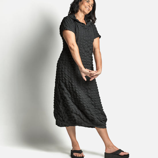 The Check - Black dress features an airy, plush fabric that delivers exceptional softness against the skin. Designed with a practical hood and short sleeves, this piece offers both comfort and casual sophistication. The lightweight construction makes it ideal for layering or wearing solo, while the fluffy texture adds tactile appeal and visual dimension to your everyday wardrobe.